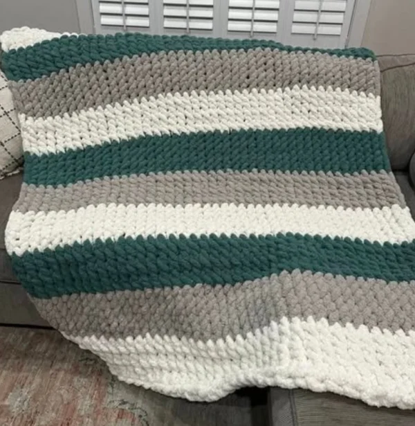 Koc wykonany z 5 motków włóczki waży około 1,25 kg – lekki, a jednocześnie ciepły i przytulny!